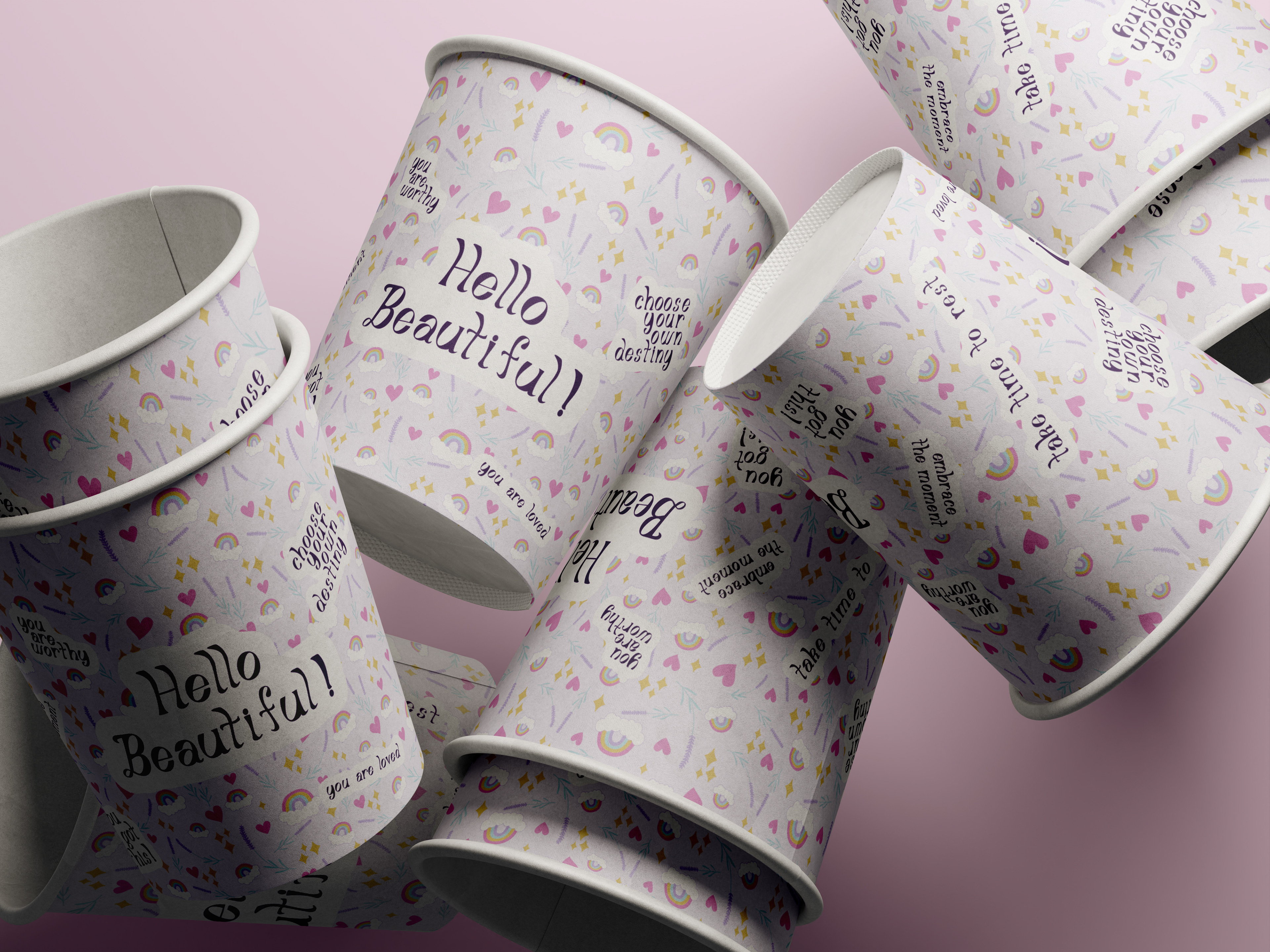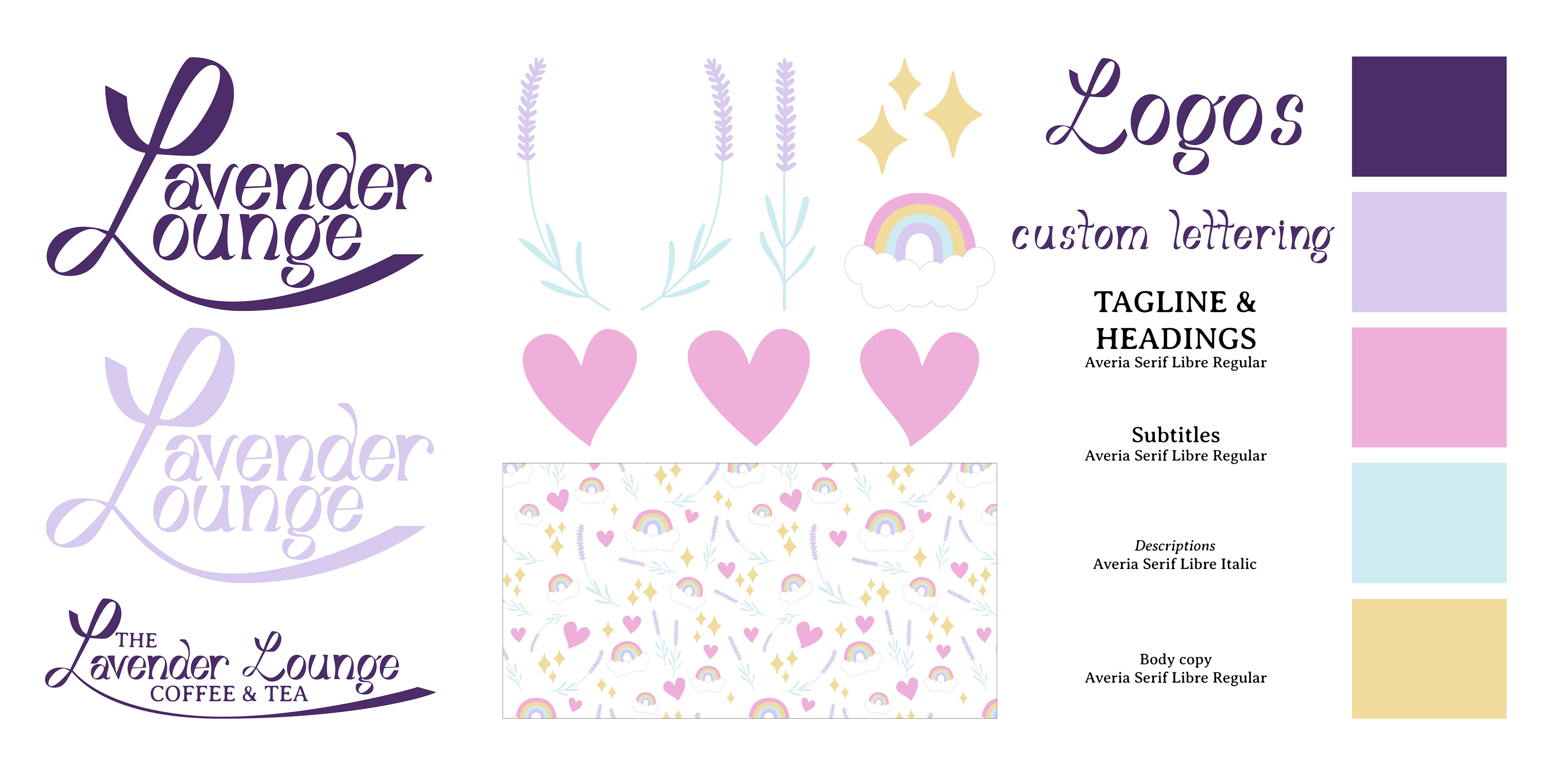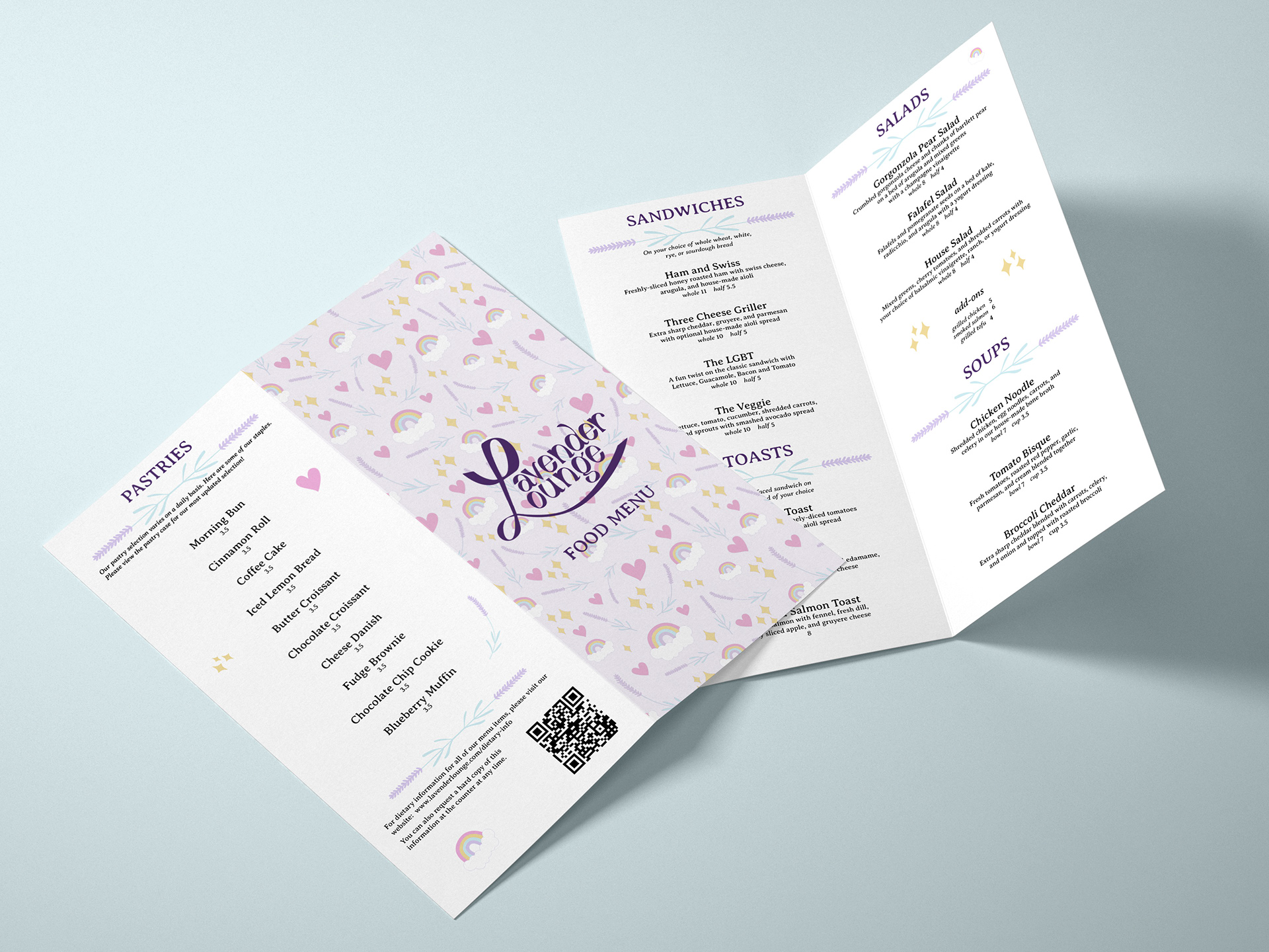 Class Project: Typography, Spring 2024. I was tasked with conceptualizing a restaurant and creating its branding and assets. The concept I chose was a coffee shop in the San Francisco Bay Area centered around the queer community. I wanted to create a relaxing and peaceful community space where people could come and work, meet up with friends, or quickly grab a nice treat to incorporate a little fun and whimsy into their day.